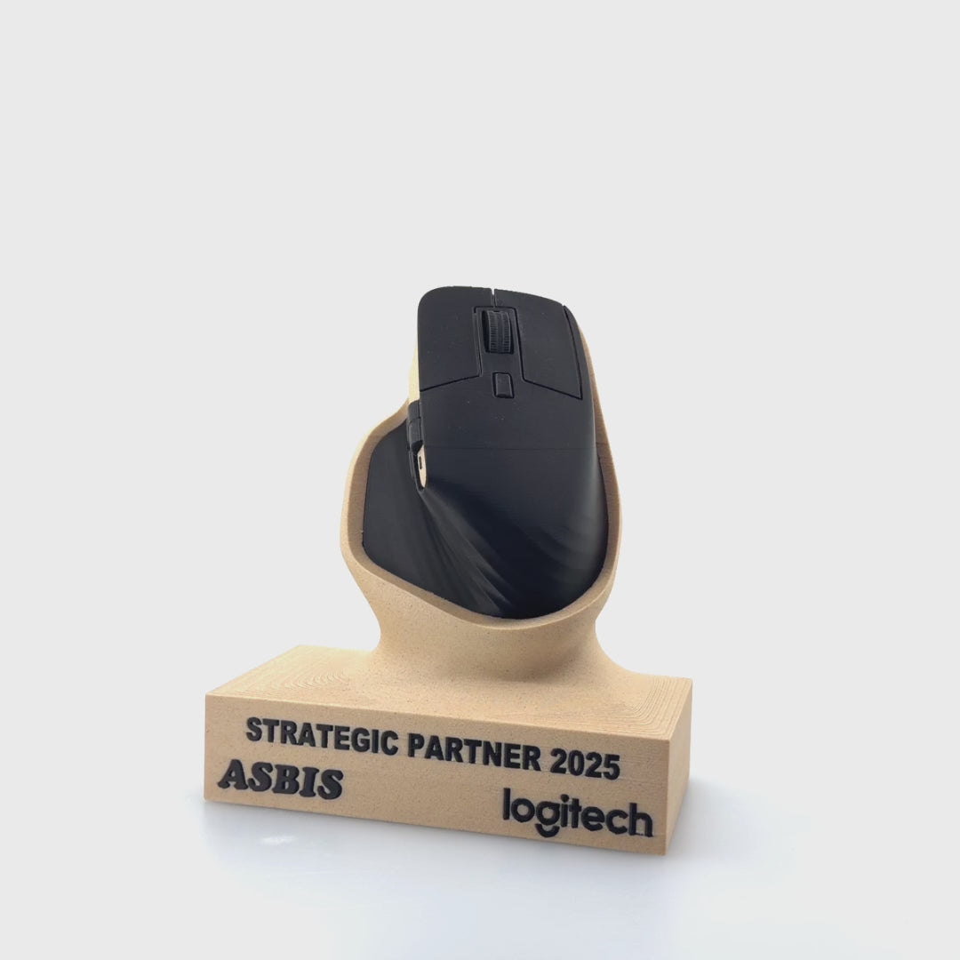 Trofeu de birou creat special pentru Logitech, realizat ca obiect funcțional și simbolic. Designul integrează un suport de mouse, transformând un gest zilnic într-un statement de recunoaștere profesională.